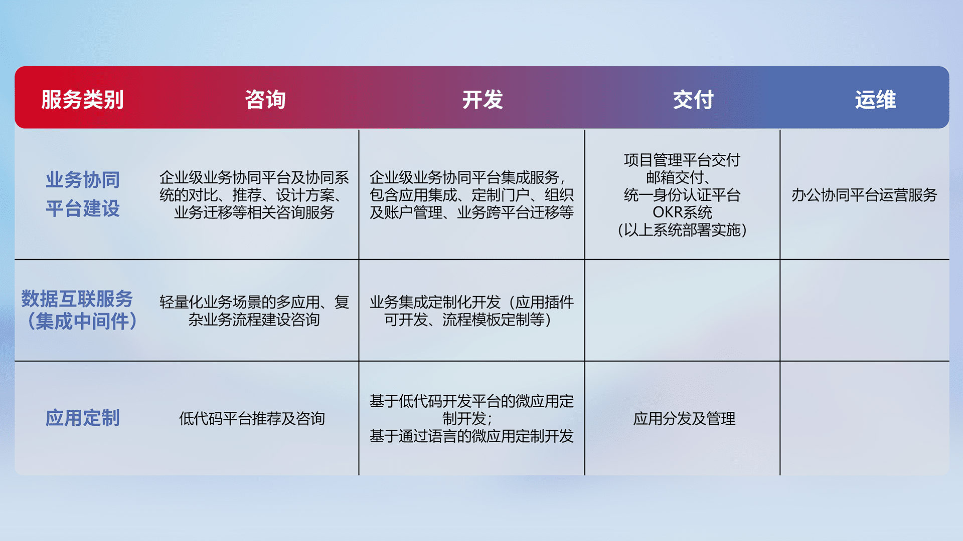 针对钉钉、、、、企微、、、IDaas等平台级产品提供产品的规划、、方案、、、、交付、、、、定制化开发等服务,,实现如统一协同办公、、智能客户服务、、混合会议管理、、、智能数据查询、、、、等业务场景,,,实现数字化转型。。。